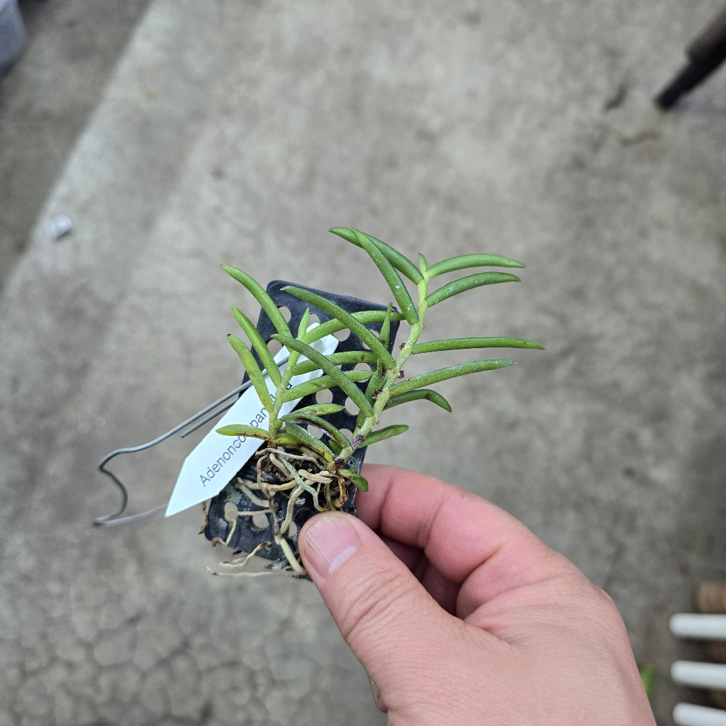 Adenoncos parviflora is an epiphytic orchid with distinctive features. Its leaves are unusually fleshy, and curved, and have grooves on the upper side. These leaves are cylindrical and look similar to round rods.