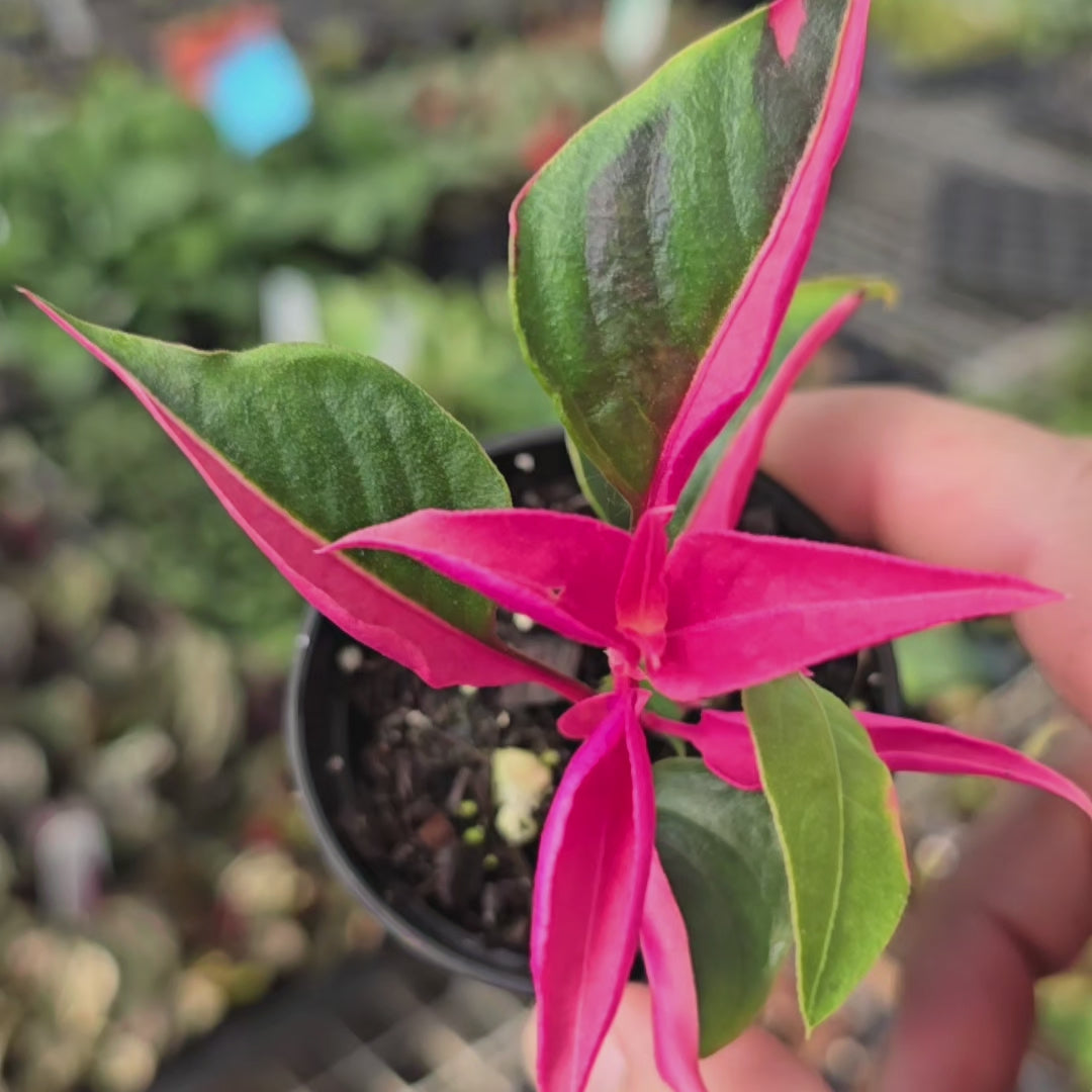 Alternanthera ficoidea has many cultivars with colors ranging from orange, red, copper, or purple. Our 'Party Time' cultivar is especially attractive with its green leaves painted with hot pink streaks and blotches. Some leaves are entirely pink and others entirely green, making this plant a showstopper year-round.