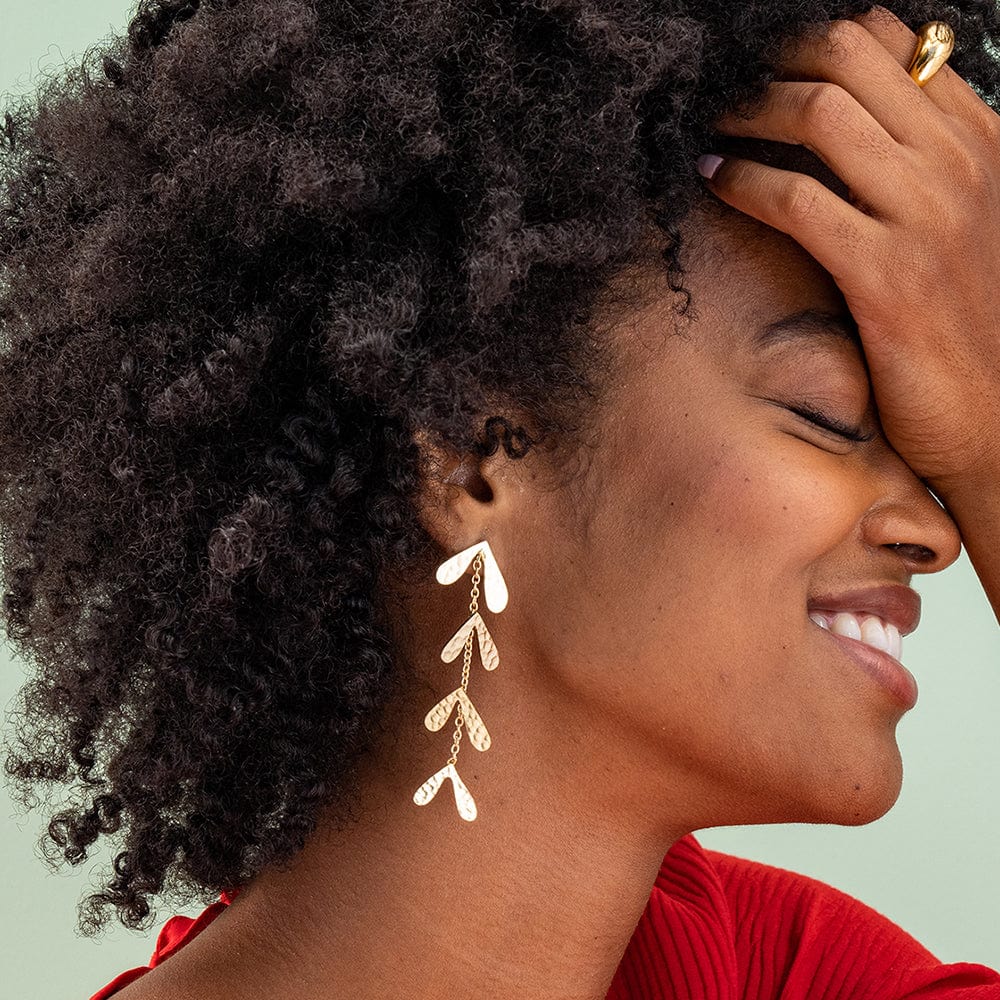 Embrace nature-inspired beauty with these earrings. Crafted from brass, these post drop earrings showcase a beautiful botanical design with a hammered textured style. With a length of 2.94" and a width of 0.85", they bring a touch of elegance and organic charm to your jewelry collection.