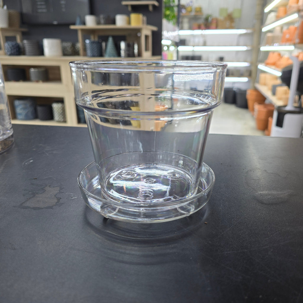 Thick acrylic planter w/ drain holes. Matching saucer included.