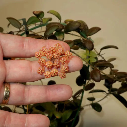 The Hoya sp. GPS 7240 is a rare find in the US. It has a distinctive look with small, oblong leaves and beautiful salmon-colored flowers.