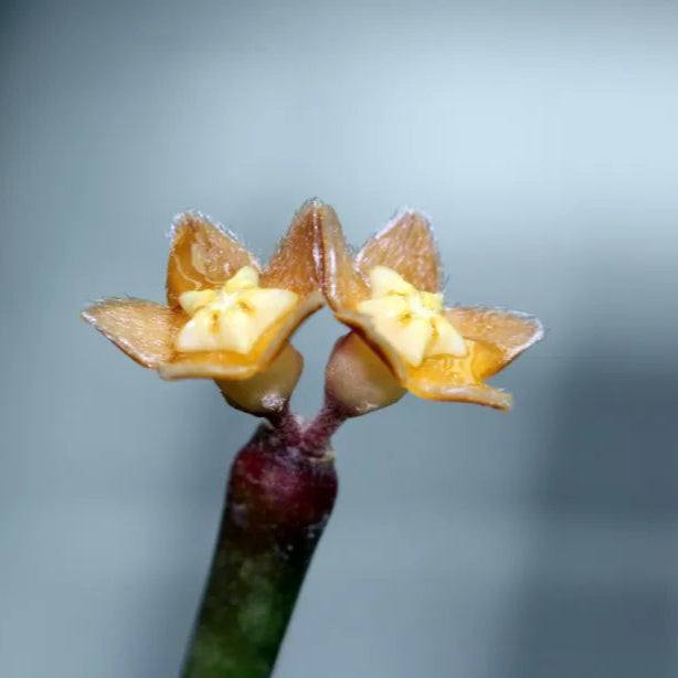 Hoya spartioides is a rare, leafless Hoya species from Borneo known for its unique, wiry green stems and small, star-shaped, orange and yellow flowers that open at night. It prefers bright, indirect light and well-draining soil, which should be allowed to dry between waterings to prevent root rot. This plant has tiny, caducous (shedding) leaves and relies on its modified stems for photosynthesis.