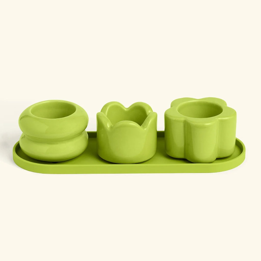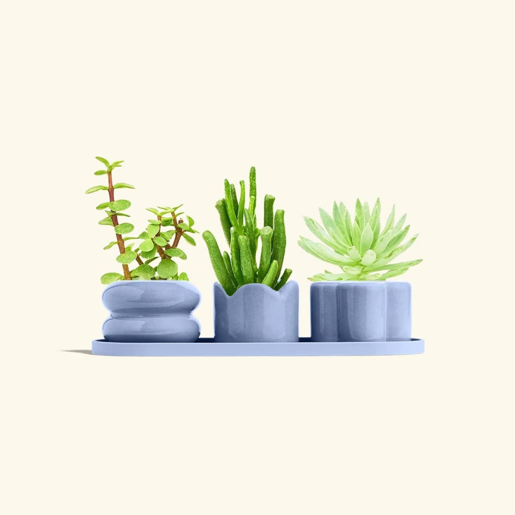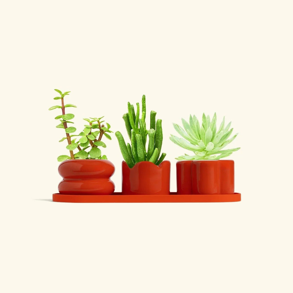 A curated set of three planters that can be displayed together or styled individually throughout your home. Featuring a selection of vibrant colors and a convenient silicone drip tray for easy maintenance, this set is perfectly suited for small plants and compact spaces in need of a touch of greenery.