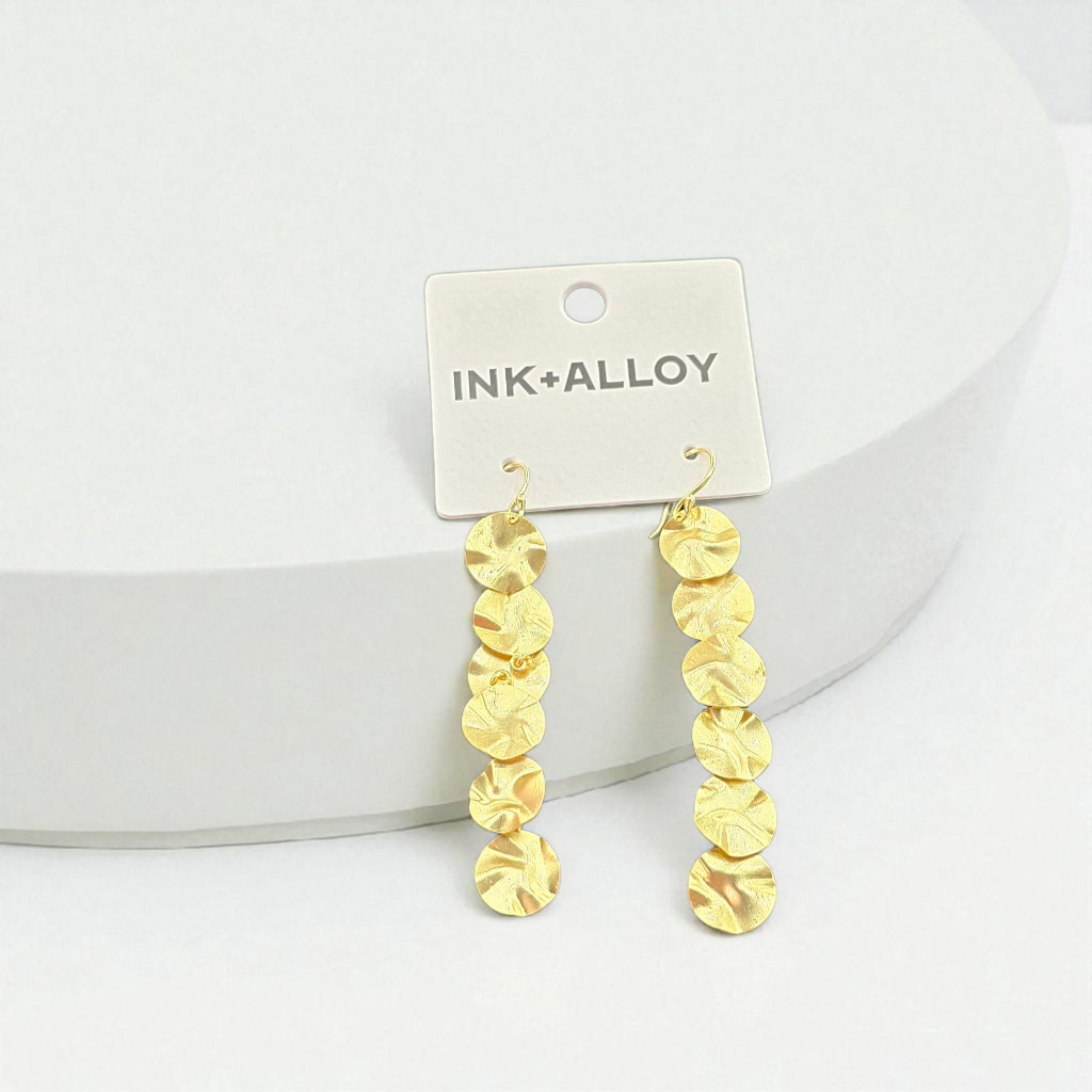 The Mya earrings feature a wavy disc design made from brass, with a lightweight, warm golden glow. They are often described as versatile, suitable for both casual and dressy occasions.