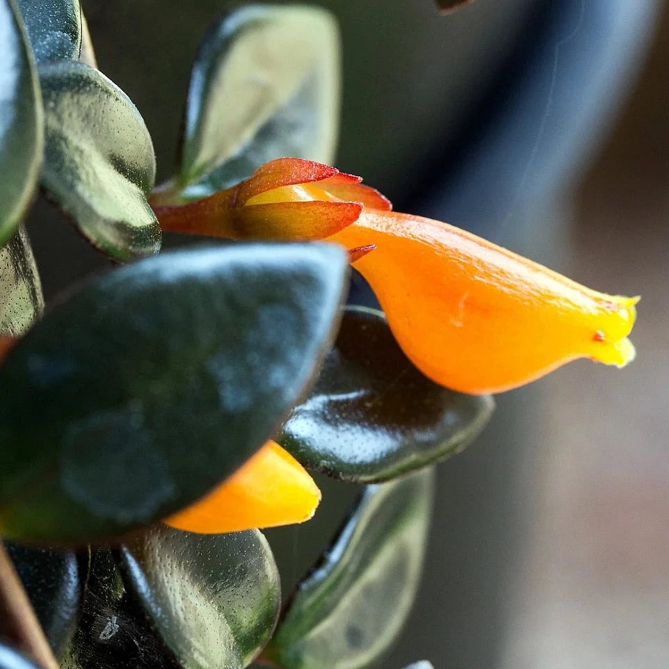 Nematanthus greg. 'Black Gold'* is a houseplant also known as the goldfish plant, with orange flowers that resemble goldfish. It has thick, waxy, shiny dark green leaves with red lines on the undersides and bright orange, pouch-like flowers.