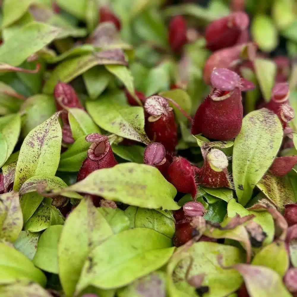 The plant produces barrel-shaped or squat pitchers that range from deep red to black, often featuring a contrasting maroon, cream, or green striped rim (peristome).