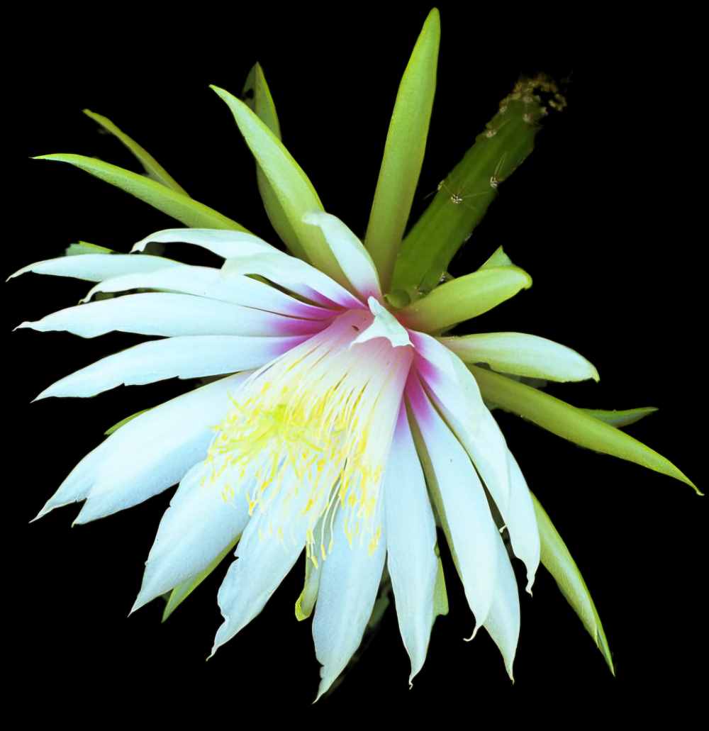 Selenicereus wercklei, also known as the Moonlight Cactus or Queen of the Night, is an epiphytic cactus originating from the lowland rainforests of Costa Rica. It is recognized by its long, cylindrical stems that can reach up to 10 feet (3 meters) in length. These green stems are covered in small white scales, giving them a fuzzy appearance.